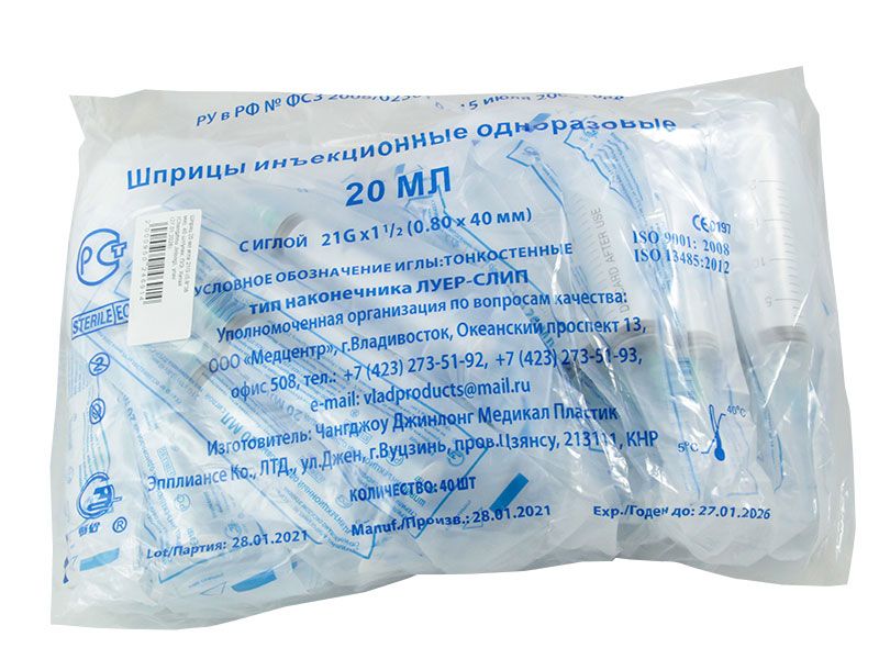 Шприц 20 мл (см3) с иглой 21Gх1 1/2 (0,80*40 мм) одноразовый стерильный, соединение luer slip, П/Э, 40 шт/упаковка, Китай (Changzhou Jinlong Medical Plastic Appliance Co. Ltd.)