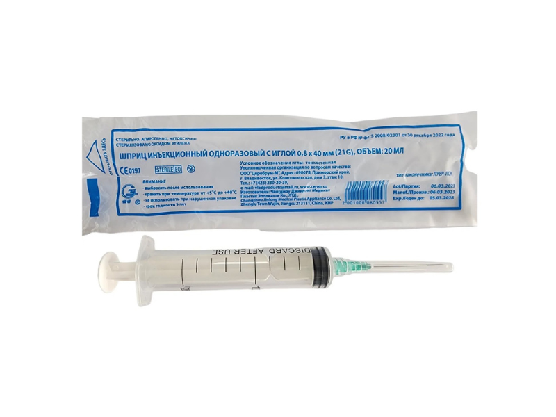 Шприц 20 мл (см3) с иглой 21G (0,80*40 мм) одноразовый стерильный, соединение luer lpk, П/Э, 40 шт/упаковка, Китай (Changzhou Jinlong Medical Plastic Appliance Co. Ltd.)