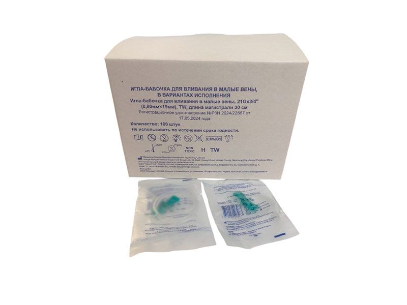 Игла (катетер)-бабочка 21G*3/4(0,8х19 мм) для вливания в малые вены, TW, длина магистрали 30 см., 100 штук/упаковка, Китай (Jiangxi Hongda Medical Equipment Group Ltd.)