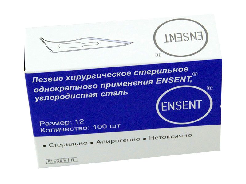 Лезвие хирургическое стерильное однократного применения "Ensent" №12, стерильный, углеродистая сталь, 100 штук в упаковке, Китай (Yancheng Huida Medical)