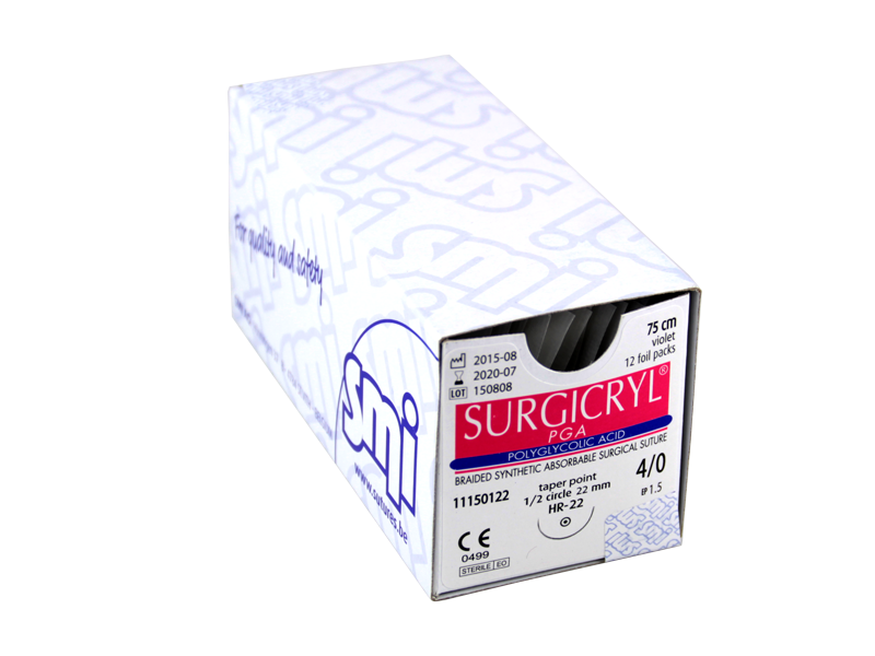 Сургикрил ПГА (Surgicryl PGA) EP(1,5), USP(4/0), длина 75 см, игла колющая (taper point) HR22 мм, 1/2 окружность, 12 шт/упаковка, Бельгия (SMI AG) 11150122