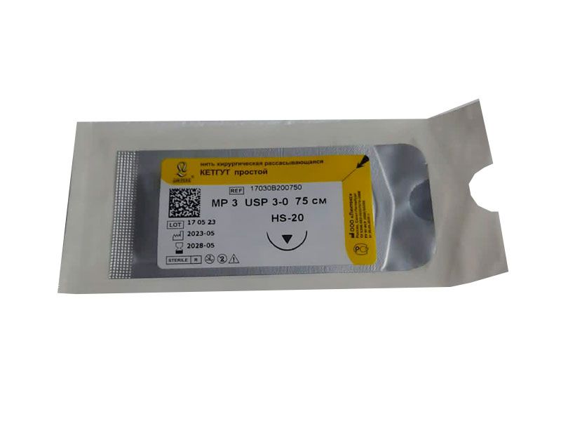 Кетгут простой МР(3), USР(3/0), длина 75 см, игла обратно-режущая HS-20, 1/2 окружности, Россия (ООО "Линтекс") 17030B200750