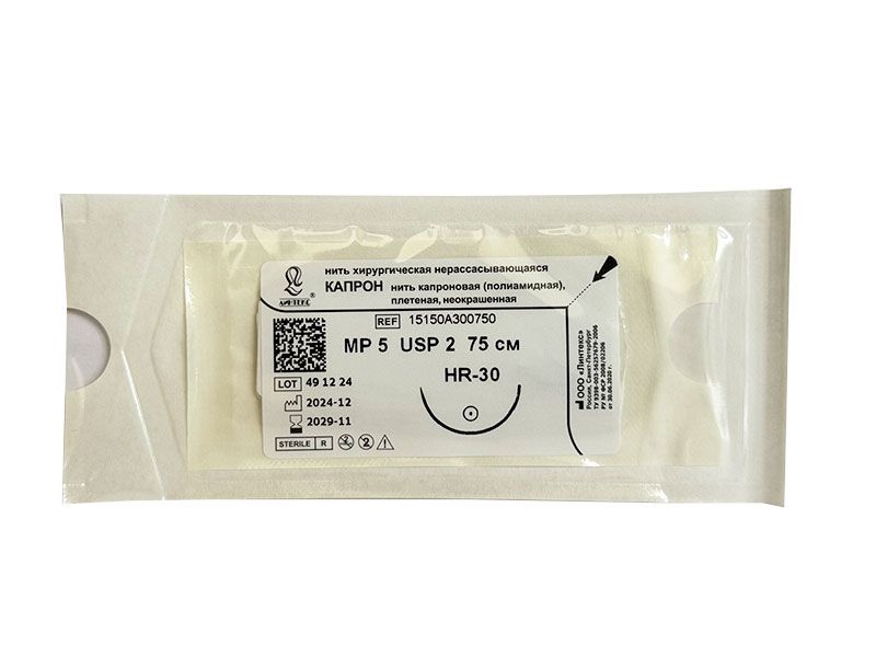Капрон плетеный неокрашенный МР(5), USP(2), 75 см, игла колющая HR-30, 1/2 окружности, Россия (ООО "Линтекс") 15150A300750
