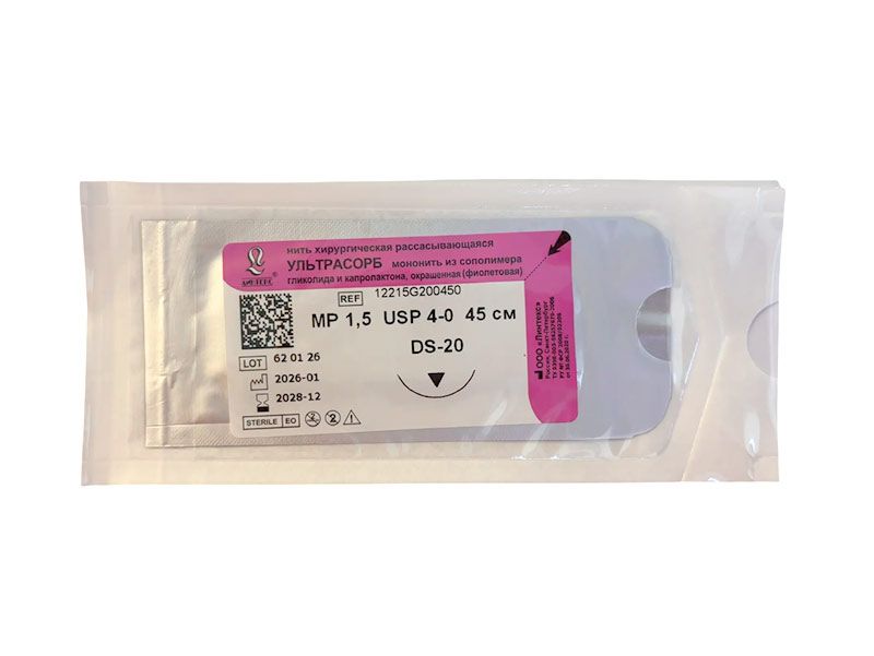 Ультрасорб фиолетовый, МР(1,5) USP(4/0), длина 45 см, игла обратно-режущая DS-20, 3/8 окружности, Россия (ООО "Линтекс") 12215G200450