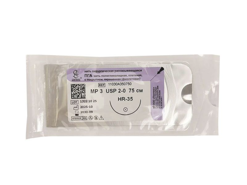 ПГА плетеный фиолетовый МР(3), USP(2/0), длина 75 см, игла колющая HR-35, 1/2 окружности, Россия (ООО "Линтекс") 11030A350750