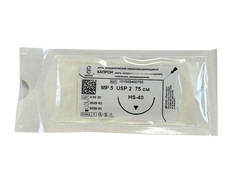 Капрон плетеный неокрашенный МР(5), USP(2), 75 см, игла колющая HR-40, 1/2 окружности, Россия (ООО "Линтекс") 15150A400750