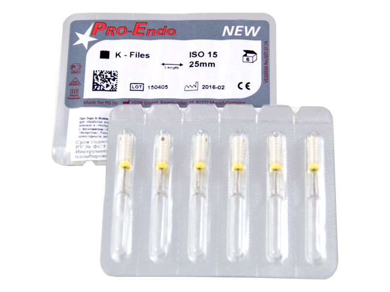 Про-Эндо К-Файлы (Pro-Endo K-Files), фасованные (в кассете по 6 шт.) - ручные эндодонтические инструменты, предназначенные для эндодонтического лечения осложненного кариеса: