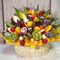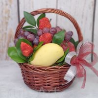 Очаровательная композиция из свежих фруктов с листьями из ананаса Ананас, киви, виноград, яблоки, апельсины, клубника, черешня 3 кг4 500 ₽Order in advance -
