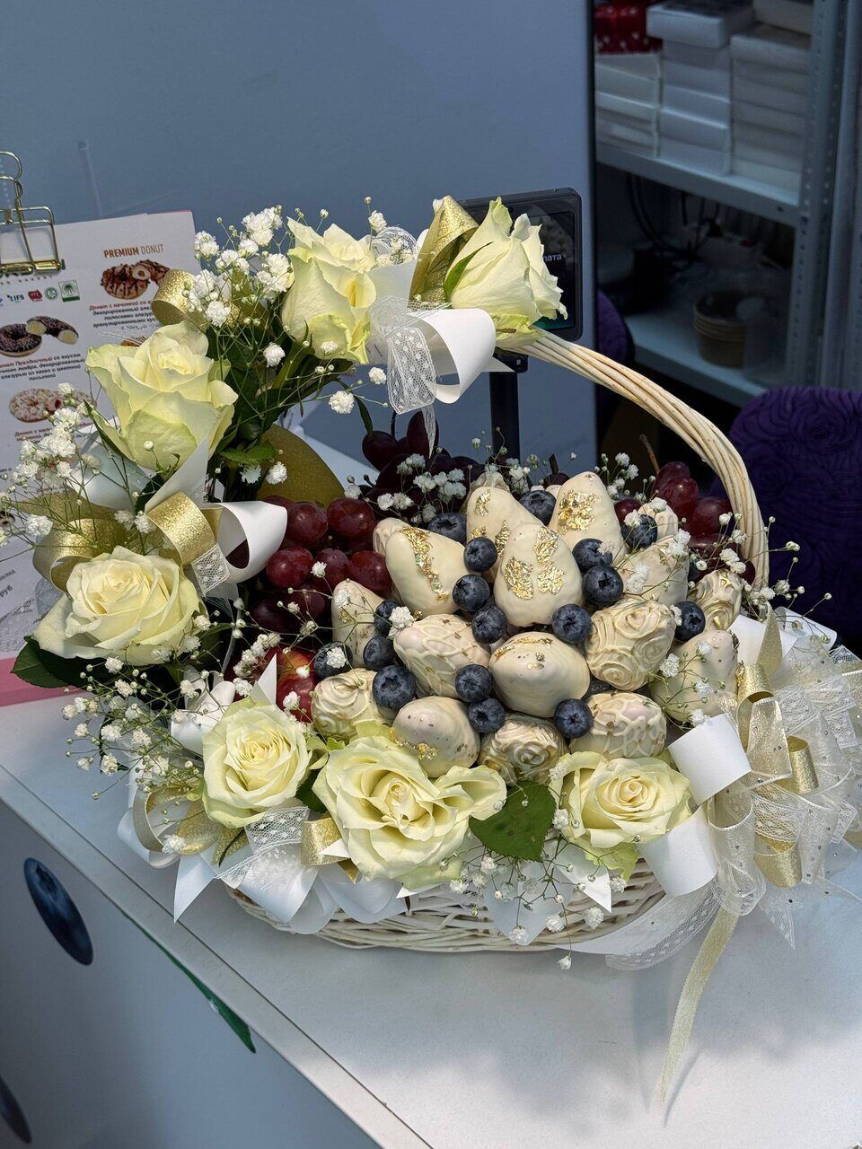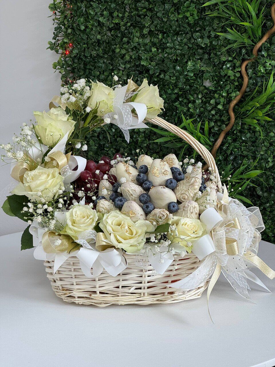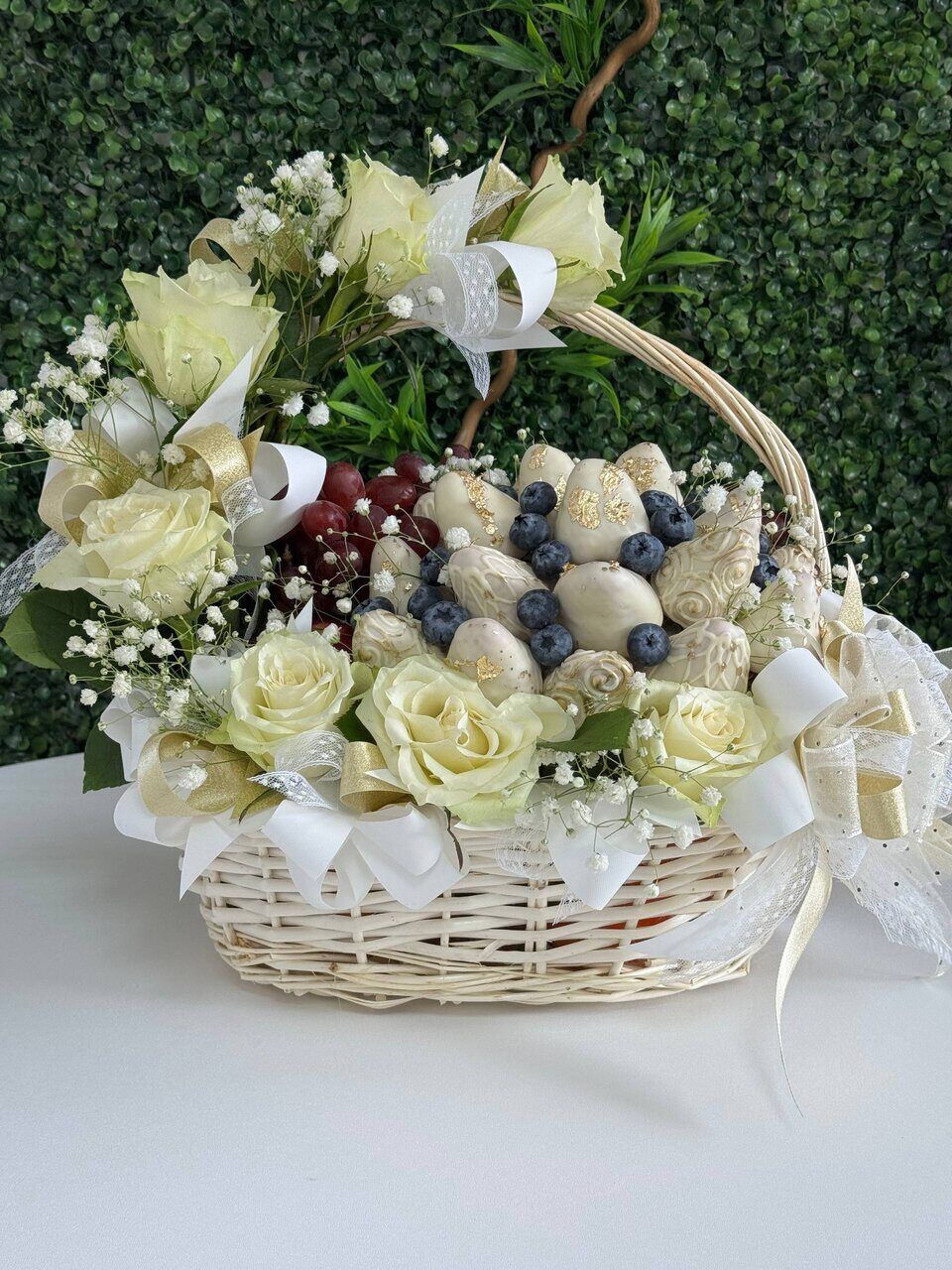 Нежная фруктово-цветочная корзина «Белое кружево»