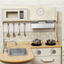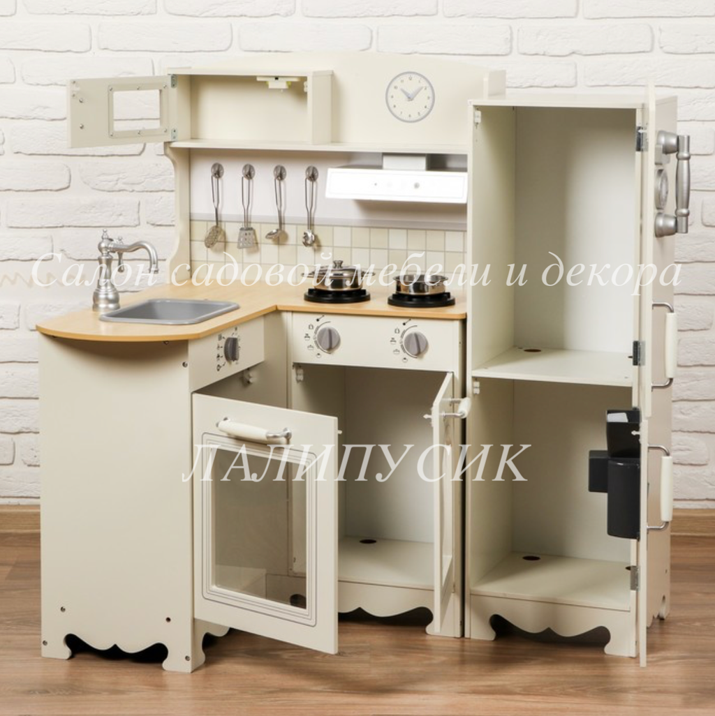 Стильная молочная кухня явно адресована будущей леди – маленькой хозяйке большого дома. Детский комплект выглядит реально, выполнен с большой любовью и вниманием к мелочам. Он позволит ребенку легко усвоить правила хозяйствования и поведения на кухне.