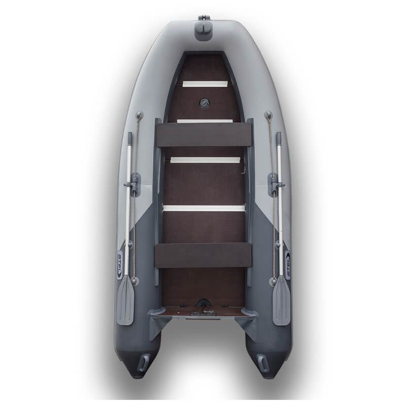 Данная моторная ПВХ лодка уже имеет все атрибуты для повышения мореходности и легкого выхода на глиссирование – киль, сплошной жесткий пайол, жестко вклеенный транец. Жесткий пайол выполнен из высококачественной морской фанеры толщиной 12 мм и усилен алюминиевым стрингером.