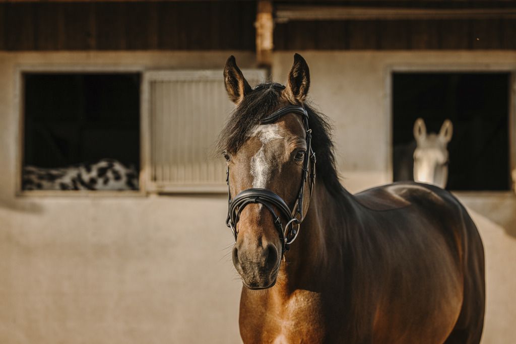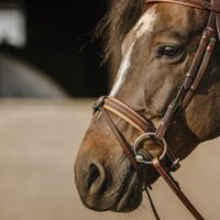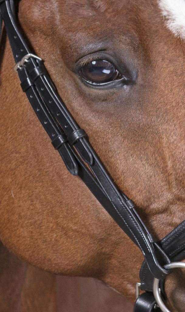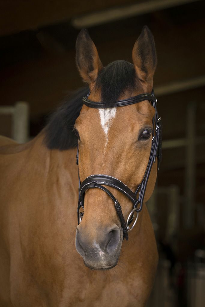 Кожаное оголовье с мягкой подложкой на суголовном и храпе, обшитым коровьей кожей и украшенной стразами. Крючки на ремешках для удил. Пряжки из нержавеющей стали. Продается без поводьев.