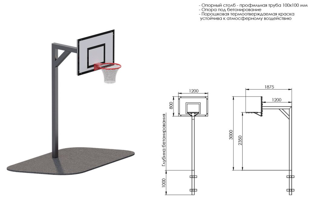• Стойка оснащена щитом и кольцом с сеткой, соответствующей требованиям ГОСТ Р 56434-2015 . Щит размерами 1200х800х9мм изготовлен из влагостойкой фанеры;