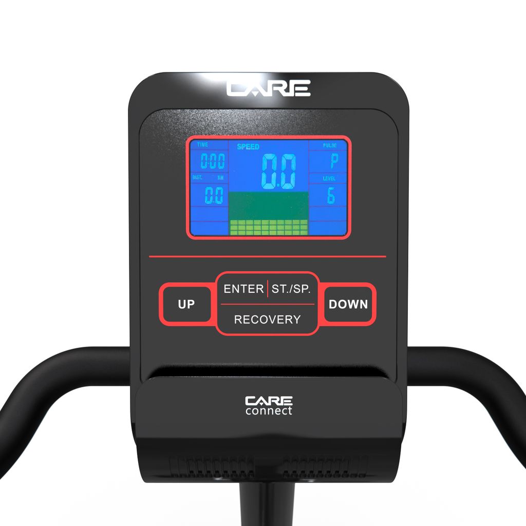 Дисплей велотренажера с синей подсветкой отображает множество параметров, включая профили пользовательских настроек, предустановленные программы тренировок, контроль мощности, контроль пульса, восстановление пульса, обороты в минуту, время, скорость, расстояние, количество сожженных калорий и ватты. На выбор пользователя представлена 21 программа тренировки, а также функция Bluetooth. С помощью Bluetooth пользователю доступно подключение к собственному гаджету и отслеживание тренировок через спортивное приложение, к примеру, FitShow.