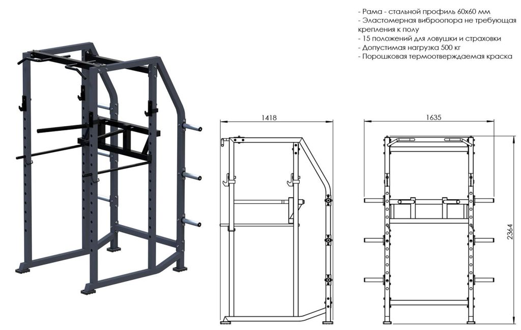 • Благодаря страховкам силовая рама прекрасно подходит для безопасных приседаний и жимов как со скамьей, так и самостоятельно.