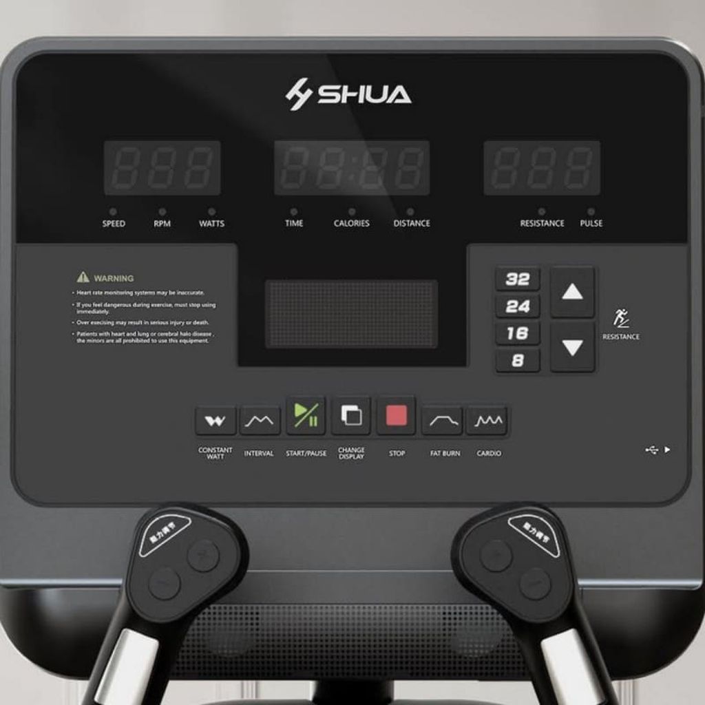Консоль тренажера имеет удобный интерфейс с белой подсветкой. Главный матричный светодиодный экран размером 15 дюймов (38,1 см) отображает обратный отчет и диаграмму тренировки. Для основных показателей, в верхней части консоли расположены 3 крупных жидкокристаллических окошка. LCD дисплеи показывают следующие параметры: скорость, обороты в минуту, Ватты, время тренировки, расход калорий, расстояние, уровень нагрузки и пульс.