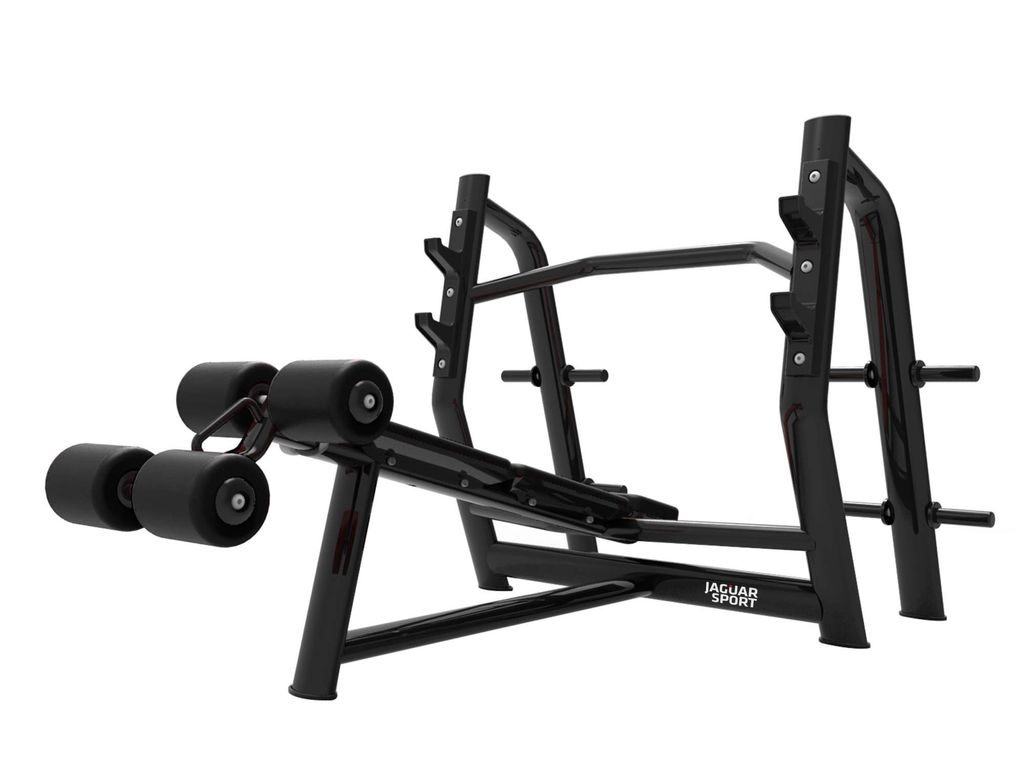- The Olympic Decline Bench features molded urethane protective racking that limits noise and protects the bar from wear for a stable and precise workout.