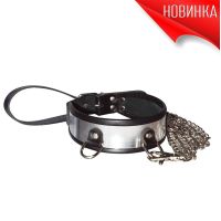 Ошейник изготовлен из высококачественной кожи черного цвета. По краю изделия проходит оторочка, обеспечивающая комфортное использование. Особенностью данной модели является вставка, имитирующая металл, которая придаёт изделию эффектности.