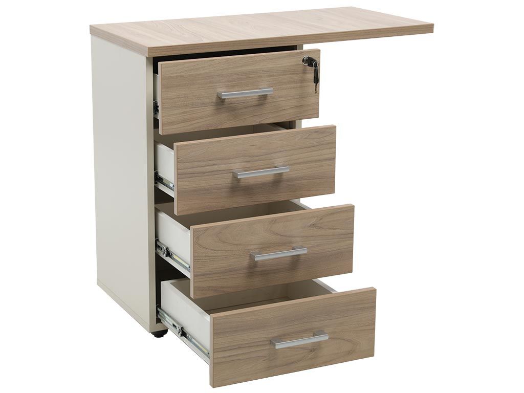 Максимальная нагрузка на ящик, кг: 8. Количество ящиков, шт: 4. Корпус и фасады выполнены из ЛДСП толщиной 18 мм. Топ из ЛДСП толщиной 25 мм, лазерная ABS кромка толщиной 2 мм. Ящики выполнены из ЛДСП и оснащены шариковыми направляющими полного выдвижения. Тумба снабжена замком и пластмассовым лотком для канцелярских принадлежностей в верхнем ящике. Возможность крепления к столу как слева, так и справа . Поставляется в собранном виде.