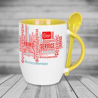 Кружка, зауженный низ, керамика, глянцевая, белая с желтыми внутренней заливкой и ручкой с ложкой [320мл] (с печатью принта, надписи, фотографии)