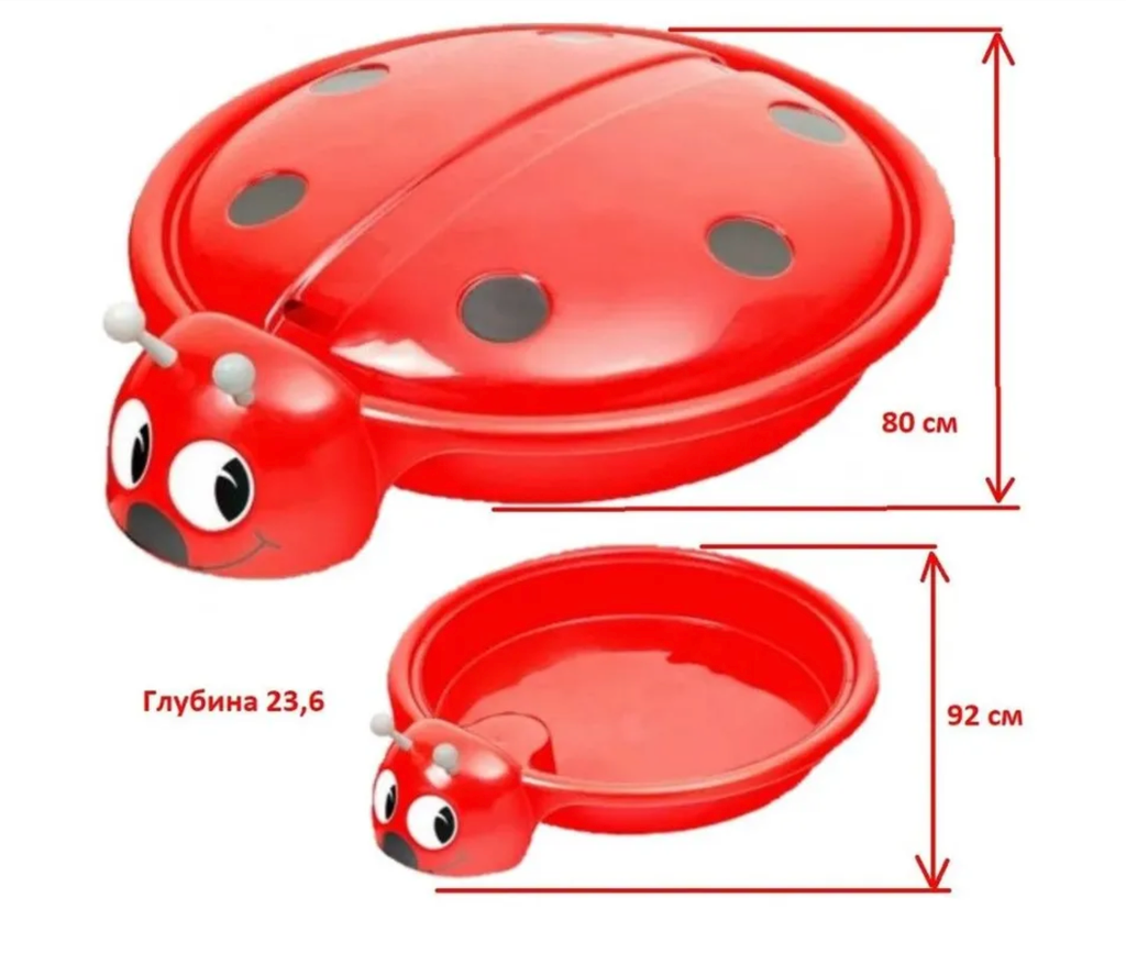 Пластиковая песочница в виде забавной БОЖЬЕЙ КОРОВКИ имеет белые пластиковые усики, дружелюбную мордочку и черные пятнышки - наклейки. Эту песочницу также можно использовать как сухой бассейн для малыша, насыпав шарики или водный бассейн, налив водички.