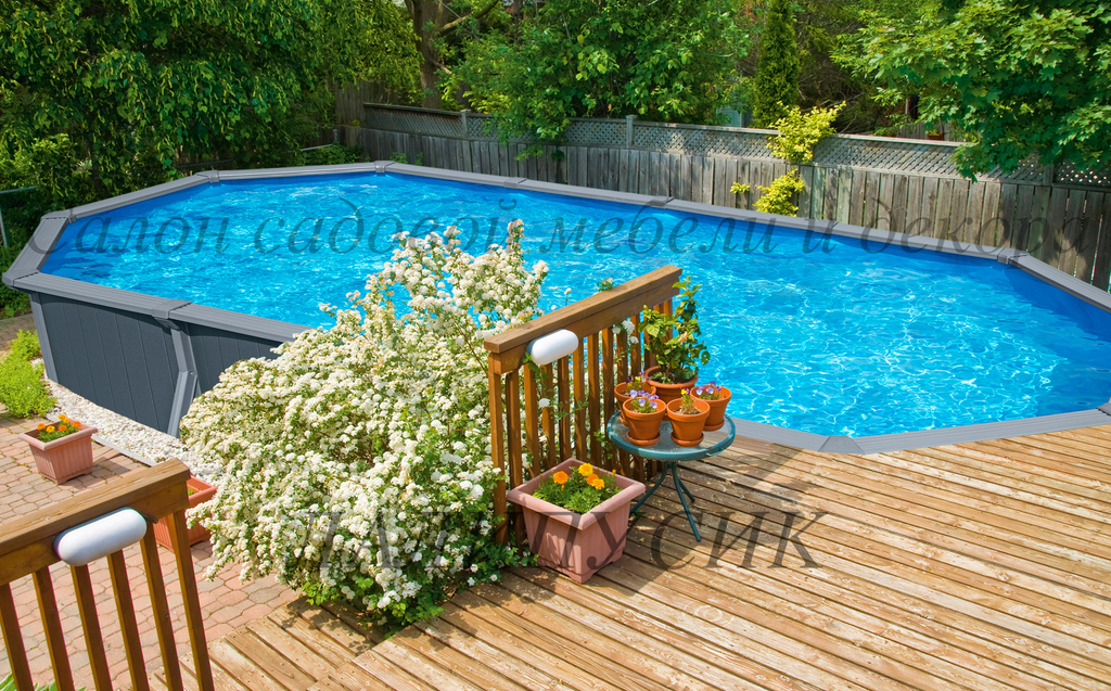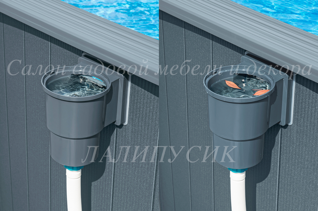 Емкость для воды 27 090 литров, оцинкованная стальные стенки с защитным покрытием. Деревянная отделка в стильном стиле из розового дерева на внешней стене. Дополнительные широкие поручни по краю бассейна обеспечивают дополнительную поддержку Треугольные опоры с обеих сторон обеспечивают дополнительную устойчивость. Внутренняя отделка из гальки мозаика придает воде бассейна мерцающий синий цвет. Очистка воды в бассейне с помощью дозатора, обеспечивает равномерное распределение химий в бассейне.