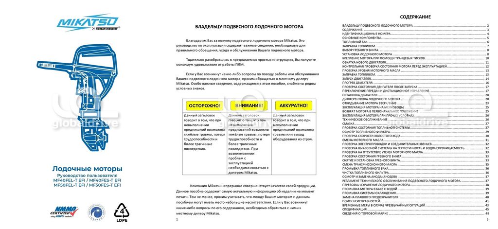 Посмотреть обзор на технику можно по ссылке: https://youtu.be/-yL_HQDQVyo Подвесной лодочный мотор Mikatsu MF40FEL-T-EFI является полным аналогом японского лодочного мотора Yamaha. Все их запчасти взаимозаменяемы, в связи с чем эксплуатация и техническое обслуживание мотора существенно упрощается. Это универсальные четырехтактные лодочные моторы представляют собой выигрышное соотношение мощности к массе двигателя дополнено укомплектованные новейшей на рынке инжекторной топливной системой EFI. Система электронного впрыска топлива обеспечивает впечатляющую мощность на больших оборотах, позволяя получить максимальное удовольствие от эксплуатация лодочного мотора Mikatsu. Вы получите непередаваемые ощущения драйва от использования лодочного мотора Mikatsu даже на малых и средних оборотах. Превосходное качество материалов и сплавов установленных в нагруженные узлы лодочного мотора позволяют гарантировать уверенную эксплуатацию в экстремальной среде. Также узлы редуктора укомплектованы японскими подшипниками и шестернями стандартов ICO фирмы NJK. Особое пятислойное лакокрасочное покрытие PPG производства США, выполненное методом катодного электролитического нанесения. Такой метод и материал наделяет поверхность коррозионностойкими и гидрофобными свойствами и дольше сохранит презентабельный внешний вид мотора. Особое внимание уделено системе широкодиапазонного изменения дифферентовки и угла наклона с электроприводом , которая позволит с легкостью контролировать сложившуюся ситуацию управления мотором. Лодочные моторы Mikatsu зарекомендовали себя в плане соотношения цены\качества\вес\экономичность расхода топлива, в следствии чего марка занимает лидирующие позиции на рынке водно-моторной техники. При возникновении гарантийного случая, Вы получите подменный товар на весь период ремонта. Стоимость приобретения данного товара в розницу в магазинах г. Южно-Сахалинск и г. Якутск составит на 6% больше, чем на сайте. При покупке данного товара в г. Владивосток или г. Хабаровск предоставляется скидка 3%.