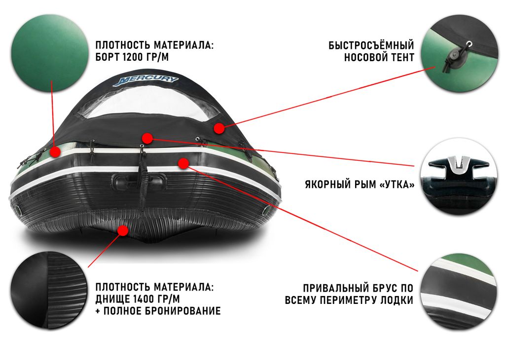 7) Адаптивная раскраска (красная – для моря, зелёная – для рыбалки)8) Носовой тент для защиты от брызг (доп. опция)9) Мягкая сумка-сиденье (рундук)