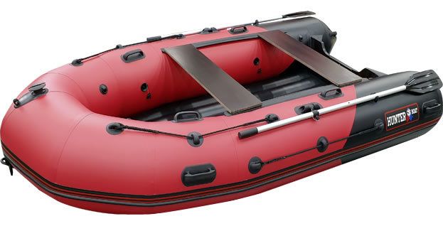 СЕРИЯ «ПРО» - большие и комфортные надувные лодки ПВХ, со стационарным надувным дном низкого давления НДНД. Современный дизайн, комбинированная расцветка корпуса, материал ПВХ плотностью 1050 гр/м.кв ( Хантер 330 ПРО изготовлена из ткани плотностью 950 гр/м.кв ), большой диаметр баллона и объемный кокпит, лишь не полный перечень преимуществ новых надувных лодок. Умеренная цена, отличные ходовые характеристики и пятилетняя гарантия, не оставят без внимания, даже самого взыскательного рыбака. Серия надувных лодок «ПРО» - предназначена для рыбалки и активного отдыха, на так называемой «большой воде», как правило, это большие реки и озера. Модельный ряд серии ПРО, представлен четырьмя размерами от 3,3 метра до 4,2 метра, а диаметры баллонов в этой серии колеблются от 0,495 м, у самой маленькой лодки Хантер 330 ПРО, до 0,54 метра, у флагмана серии Хантер 420 ПРО. Хантер 330 ПРО – самая компактная лодка ПВХ в серии «ПРО». Это лодка со стационарным вклеенным умеренно-килевым дном низкого давления (НДНД) рассчитана на использование с мотором до 15 л.с. и пассажировместимостью 3 человека. Предназначена для рыбалки, охоты и активного отдыха на воде. Выпускается только в одном комбинированном красно/черном цвете. Благодаря надувному дну низкого давления НДНД, подготовка лодки для спуска на воду занимает не более 15 минут - достаточно просто накачать надувные отсеки и дно, а так же установить банки и весла. Сборка лодки, так же удивит своей простотой – нужно просто открыть клапана, стравить воздух и свернуть лодку в сумку. В собранном состоянии лодка перевозится в одной сумке, которая изготовлена в виде конверта. Транец лодок серии ПРО изготовлен из ламинированной водостойкой фанеры, толщиной 27 мм. На транце со стороны кокпита установлена пластиковая накладка под мотор, с внешней стороны транца установлена деревянная накладка. Так же на транце надувной лодки установлен сливной клапан. Надувное дно серии лодок «ПРО» - является умеренно-килевым и имеет рабочее давление 0,35 атм. Дно НДНД представляет собой замкнутый и независимый герметичный отсек, который вклеен между баллонами лодки. С внешней стороны надувного дна. установлена специальная жесткая пластина, так называемый "интерцептор", он существенно облегчает выход на глиссирование, и управление лодкой. Конструкция, надувного дна имеет необходимую жесткость и обеспечивает лодке высокие скоростные характеристики, позволяя выходить на глиссирование даже под маломощным мотором.