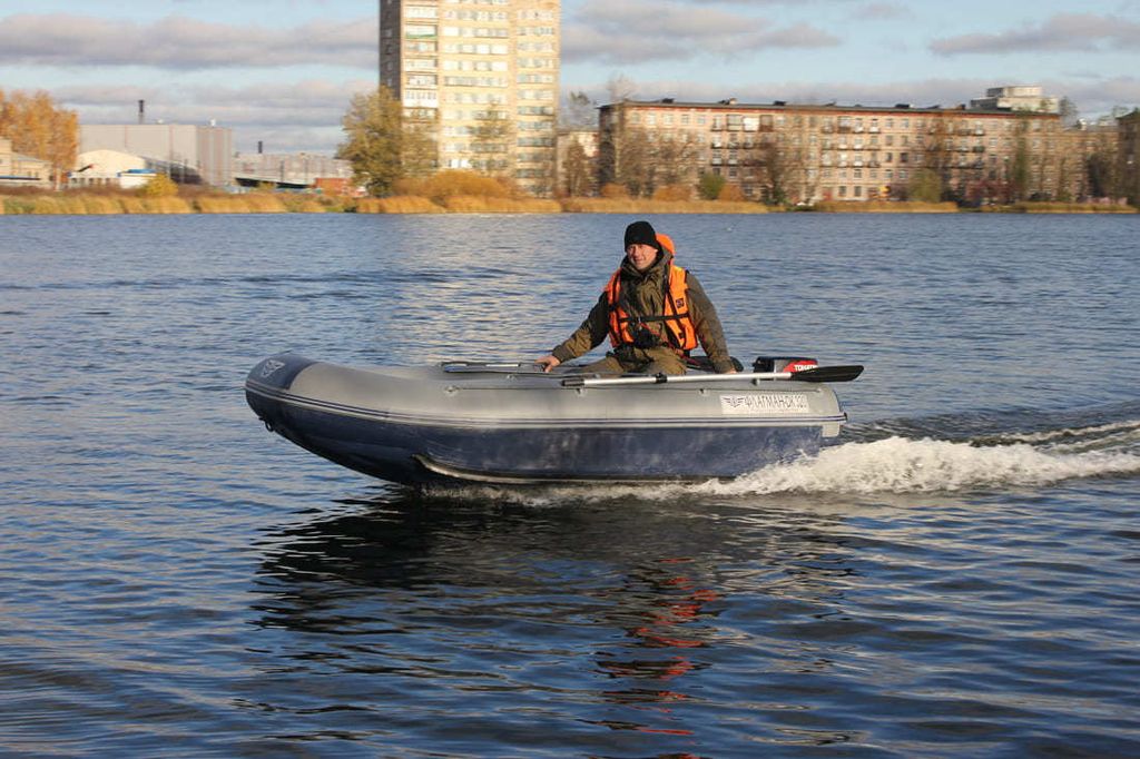 Во время сборки надувного судна с надувным дном – вы не занимаетесь монтажом пола, а просто надуваете его. Диаметр баллонов 40 см, что обеспечивает комфортную посадку. Уникальные обводы сравнимые с обводами жестких судов. Как следствие - высокие скоростные характеристики, улучшенные мореходные качества и отличная управляемость. Плотность материала ПВХ – 850 г/кв.м. В ней можно лежать, сидеть как на надувном матрасе, можно перевозить габаритные и объёмные грузы. Она рассчитана на – 3 человека, максимально допустимая грузоподъемность –450 кг. Вес – 38 кг. Имеется транец для мотора до - 10 л.с. Также оснащается передвижными сидениями – для комфортного расположения. Продуманные конструктивные решения позволяет не затрачивать много времени на сборку, а также обеспечивают простую и комфортную транспортировку.