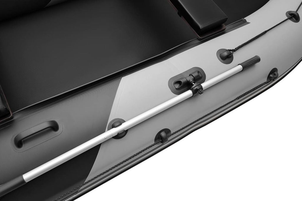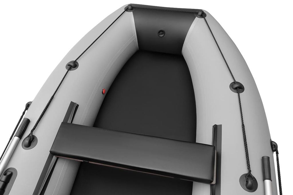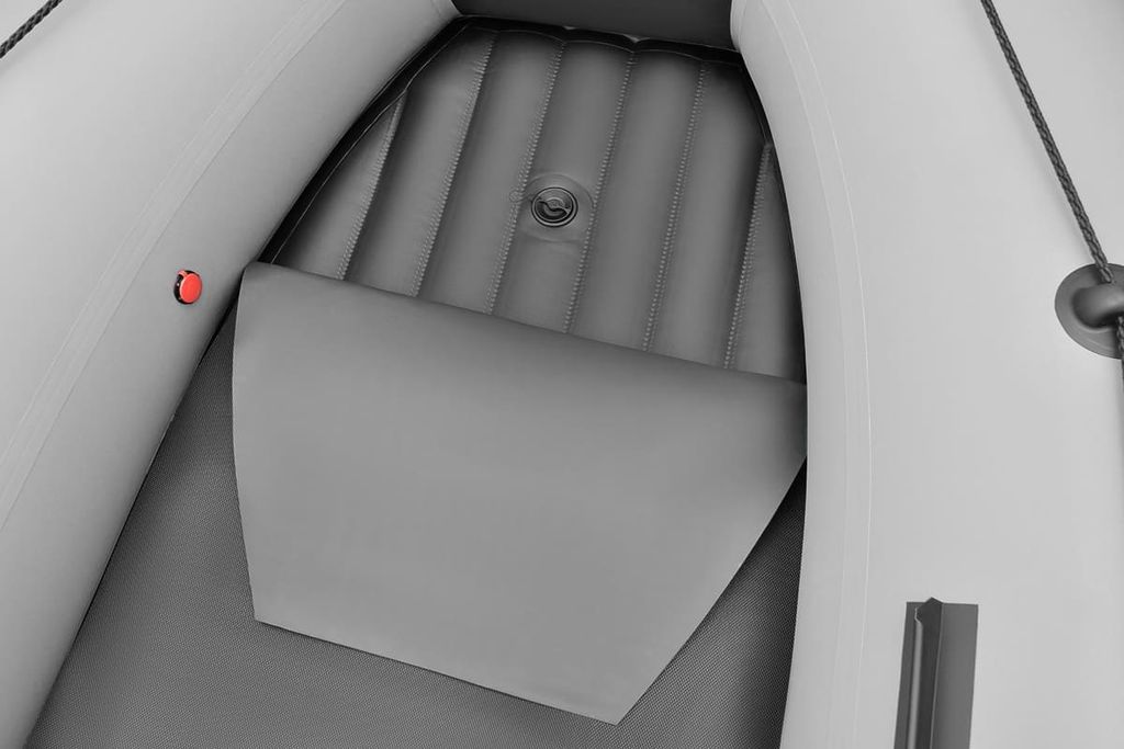 Неразборный корпус лодки и дна позволяет произвести сборку и разборку быстро, и не займет у Вас много времени и сил, Вам останется только наполнить надувные секции воздухом, и Ваша лодка готова к эксплуатации, время сборки лодки менее 15 минут. Независимые отсеки надувного дна, при наполнении их воздухом преобразуют дно в V - образную форму, что дает лодке превосходную управляемость по волне, а смещенный транец - просторный кокпит и небольшой вес лодки