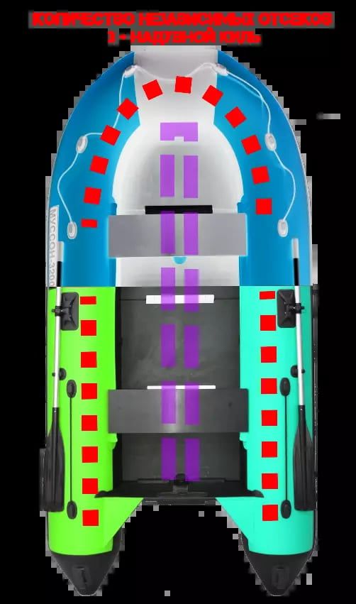 В дополнении к высокоплотному материалу ПВХ дно лодки имеет специальную прорезиненную защиту от различного рода физического воздействия при движении. Бортовой привал оберегает от попадания брызг в пассажирскую часть судна. Лодку образуют три надувных отсека и киль. Лодка оборудована клапаном избыточного давления – предохранительным клапаном, который способствует сбросу избыточного давления, в случае, если оно превышает допустимые нормы при накачивании.