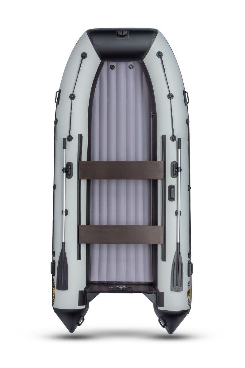 Лодка ПВХ Андромеда Air 380 — “золотая середина” всего модельного ряда Air. Идеально подойдёт для комфортной рыбалки 5 человек. Конструкция лодки выполнена в виде 3-секционного баллона, а отдельный надувной отсек значительно улучшает скоростные характеристики модели. Материал производства — высокопрочный ПВХ плотностью 1000 г/кв.м на баллонах и 1100 г/кв.м на днище. Материал с двусторонним полимерным покрытием, а также с добавлением термопластичного полиуретана. Это значит, что лодка готова к большим перепадам температур и спокойно выдержит рыбалку даже на 30-градусной жаре. Общая грузоподъёмность лодки составляет целых 800 кг, при собственном весе всего 45 кг. Для дополнительной безопасности модель оснащена подрывным и сливным клапанами, а оптимальная мощность мотора для Андромеда Air 380 составляет 20 л. с. Сдержанный бело-серый дизайн позволит лодке не нагреваться на жаре и делает её менее заметной во время рыбалки.