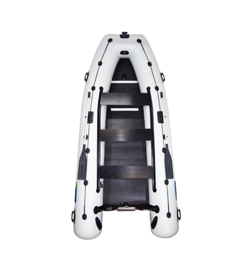 Лодка ПВХ Омега 450 KU PFA lux — шестиместная, имеет 4 гермоотсека + надувной киль, стравливающий клапан, подвижные сидения, усиленное днище и транец для мощного мотора. Дно лодки оборудовано наборным деревянным пайолом на алюминиевых стрингерах.