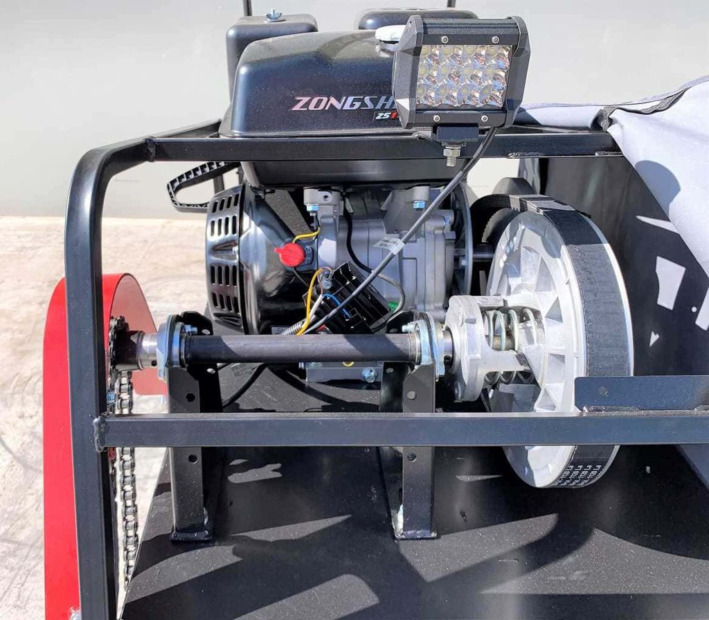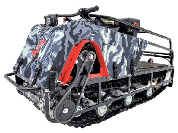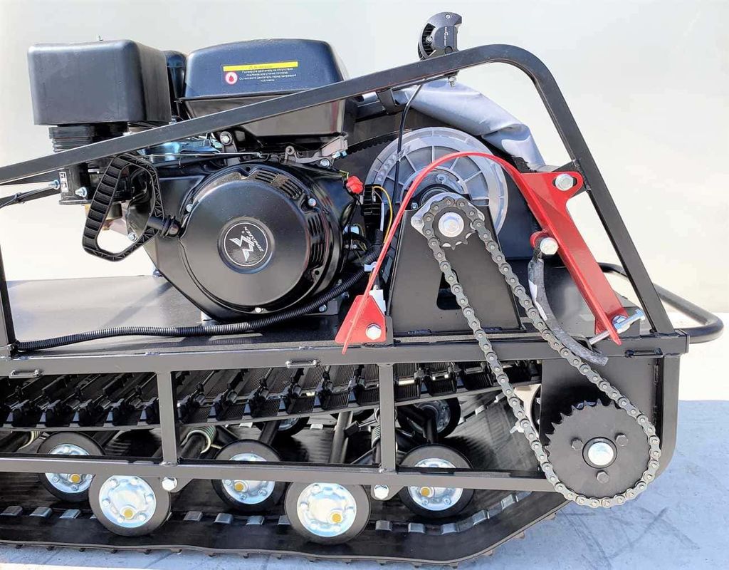 На мотособаку на заводе ставят китайские движки марок Лифан или Лончин мощностью 15 или 20 лошадиных сил. Данная мощность позволяет перевозить груз на самой платформе мотобуксировщика до 50 кг, а сзади в санях до 300. При тестировании аналогичных буксировщиков мы увозили и 500 кг по укатанной дороге, но в глубоком снегу любой мотобуксировщик с большим грузом будет зарываться в снег. Однако если к данному мотобуксировщику приобрести лыжный модуль или модуль толкач проходимость мотобуксировщика значительно возрастет. А также повысится комфорт от управления. Управлять мотобуксировщиком с толкачем или лыжным модулем значительно легче, а также повышается скорость передвижения мотобуксировщика, тк при езде в санях сзади образуется сильная метель из под гусеницы, все это летит в лицо и ехать быстрее 20-30 км/час уже не хочется.
