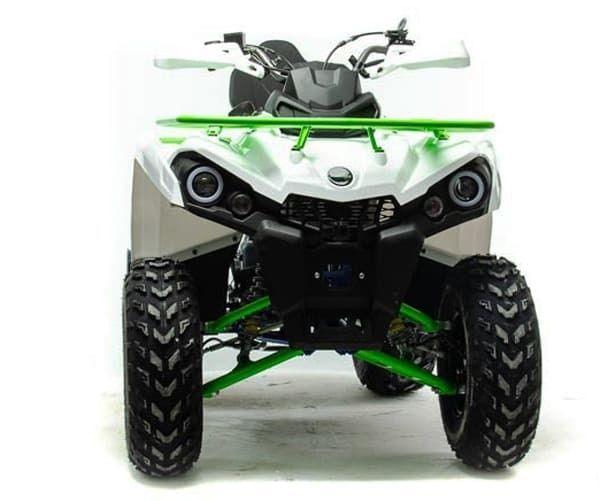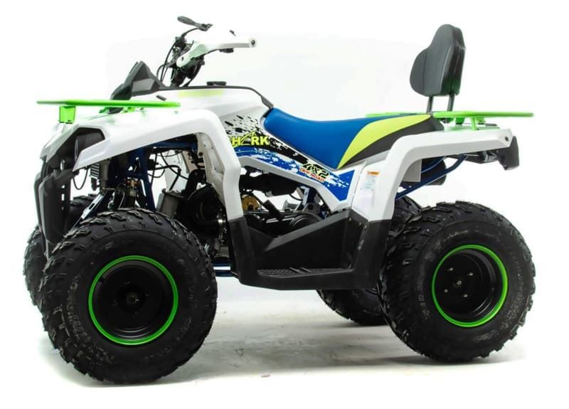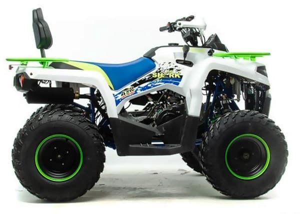 Квадроцикл доступен в белом цвете с модернизированной светодиодной оптикой, ходовыми огнями и поворотниками отлично выглядит в своем новом агрессивном стиле. Дополнительная спинка пассажира, а так же USB разъем. ATV SHARK 200 весит 160 кг, выдерживает нагрузку до 150 кг. Рама стальная, трубчатая, покрашена в цвет металлик. Прочный облицовочный пластик не ломается при сгибании, герметизированная проводка защищает от грязи. Размер задних колес — 10 дюймов (250-96), переднего — 10 дюйм (180-90), а так же усиленной задней осью. Система зажигания электронная (CDI). У квадроцикла отличный запас хода: объём топливного бака — 10 л, расход топлива — 4/5 л на 100 км. Передние светодиодные фары обновленного дизайна легко включается поворотом замка зажигания и позволяют ездить в сумерках и темноте. Данная модель оснащена 1-поршневыми тормозными суппортами, спереди и сзади. Тормозной шланг армированный. Имеется стояночный тормоз как передних так и задних колес. Есть возможность установить лебедку.