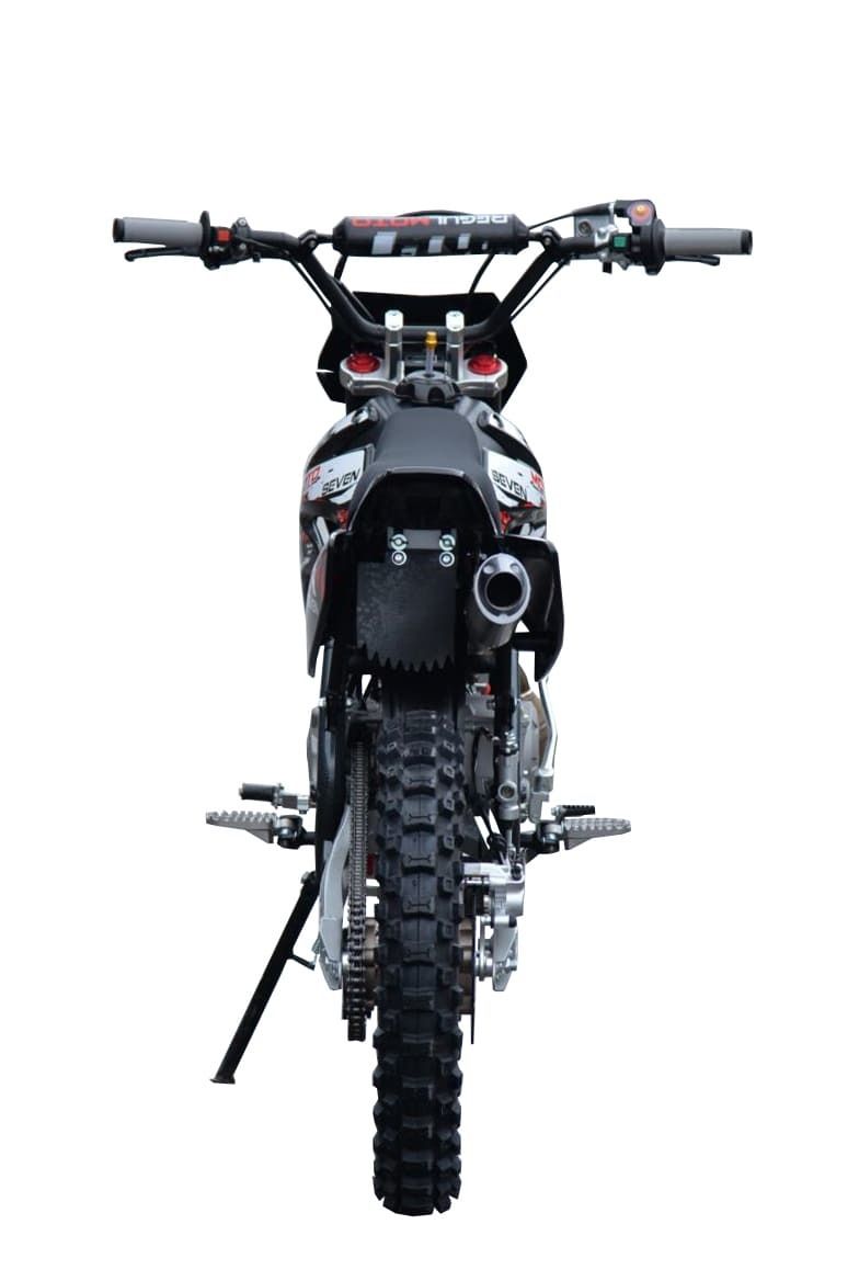 Колеса питбайка размером 17/14 дюймов с усиленными алюминиевыми ободами на 36 спиц «обуты» в качественную кроссовую моторезину Kenda. Установленные на колесах буксаторы предотвратят проворачивание покрышки и защитят камеры от возможных повреждений. Питбайк комплектуется фарой головного света; она включается при помощи поворота ключа в замке зажигания. В качестве элементов защитного обвеса используются пластиковые обтекатели типа CRF. Подбор комплектующих свидетельствует о полной готовности питбайка к покорению бездорожья. Среди стоковых компонентов питбайка стоит отметить: