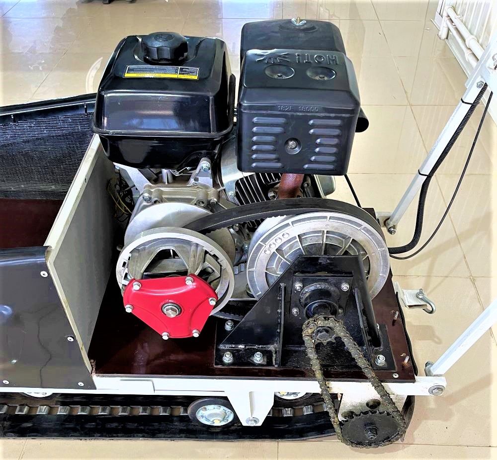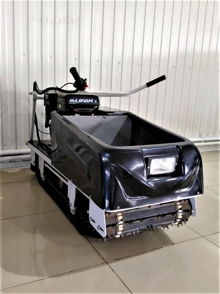 Мотособака весит 105 кг, а размер ее составляет 141 см в длину, 62 см в ширину и 77 см в высоту. Модель оснащена гусеницей шириной 500 мм. Гусеница в сочетании с катковой подвеской способна проходить спокойно по льду и даже по территории без снега.
