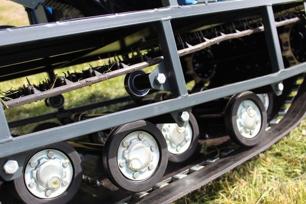 На мотобуксе установлена катковая подвеска. Катки устанавливаются на оси и предназначены для смягчения ударов и вибраций, возникающих при движении по неровной местности. Подвеска также способствует лучшей проходимости и устойчивости мотобуксировщика, обеспечивая более комфортное и безопасное передвижение как в сельской местности, так и на дорогах.