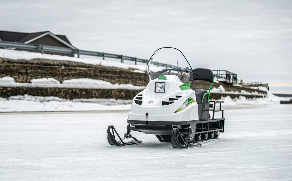 Снегокат оснащен защитой двигателя, улучшенной задней подвеской с амортизатором. Гусеница имеет длину 2828 мм и ширину 500 мм. Снегоход также имеет простую и надежную переднюю 2-х лыжную рессорную подвеску и стальные лыжи, что обеспечивает отличную управляемость и маневренность.