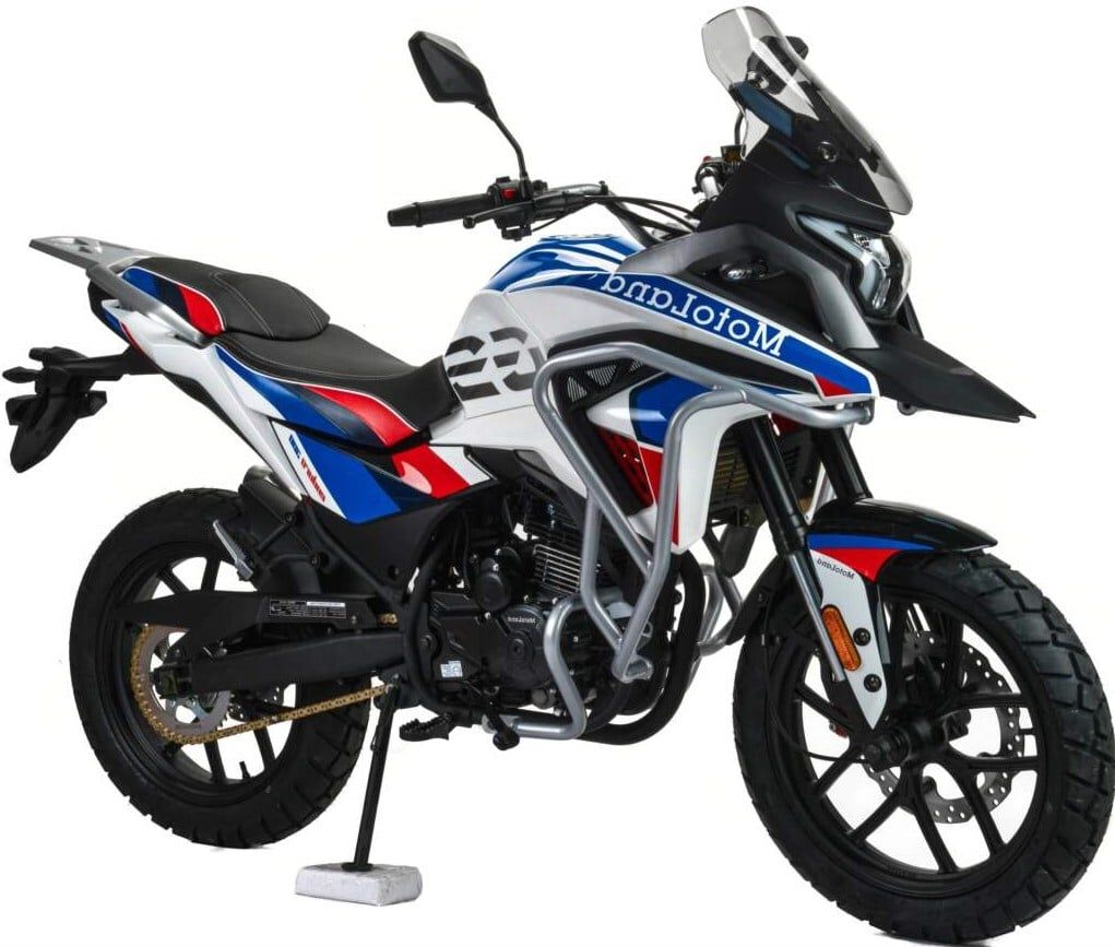 Motoland GS ENDURO является классическим турэндуро с укороченной колесной базой в размере 1330 мм. Он обладает вертикальным углом наклона вилки около 70 градусов и прямой посадкой, что делает его идеальным выбором как для начинающих райдеров, так и для опытных мото путешественников. Особенностью такой геометрии является легкость управления на низких скоростях. В сочетании с мощным двигателем ZS 172FMM-5 (PR250 с балансировкой), выдающим 21 лошадиную силу, мы получаем комфортный мотоцикл для городской езды и путешествий как по асфальту, так и по пересеченной местности. Мотоцикл Motoland GS ENDURO характеризуется своим ярким и узнаваемым дизайном, прочной рамой из Cro-mo труб, обладающей высокими прочностными характеристиками, а также современной подвеской с выносными регулировками компрессии и отскока. Он оснащен ободами из алюминиевого сплава, наличием электростартера, прямоточным выхлопом и LED оптикой с возможностью переключения между ближним и дальним светом. Двигатель ZS 172FMM-5 с балансирующим валом обеспечивает интуитивно понятную отдачу мощности и работает на воздушном охлаждении. Cro-mo рама обладает высокой прочностью, долговечностью и ремонтопригодностью. LED фара с двумя режимами работы обеспечивает яркое освещение в темное время суток, а влагозащищенная приборная панель обеспечивает надежность и защиту электроники. Литые алюминиевые колеса с размерами 2.5x17 110/80 - 3.5x17 130/80 значительно снижают неподрессоренную массу мотоцикла, обеспечивая великолепную работу подвески даже на неровных дорогах и комфортную поездку для райдера. Удобное мягкое сиденье, ветровое тонированное стекло, USB-зарядка и жидкокристаллическая цветная приборная панель с подсветкой - заставят радоваться комфорту и удобству. Мощные гидравлические 4-поршневые дисковые тормоза, а также резина, обеспечивают отличное качество разгона, торможения и устойчивость в поворотах как на асфальте, так и на сухих грунтовых дорогах. Они также обладают высокой износоустойчивостью. Защита картера двигателя и стальные звезды увеличивают надежность и срок службы мотоцикла. Багажник на заднем крыле и подножки для пассажира позволяют удобно перевозить груз и предоставляют дополнительные возможности для пассажира.