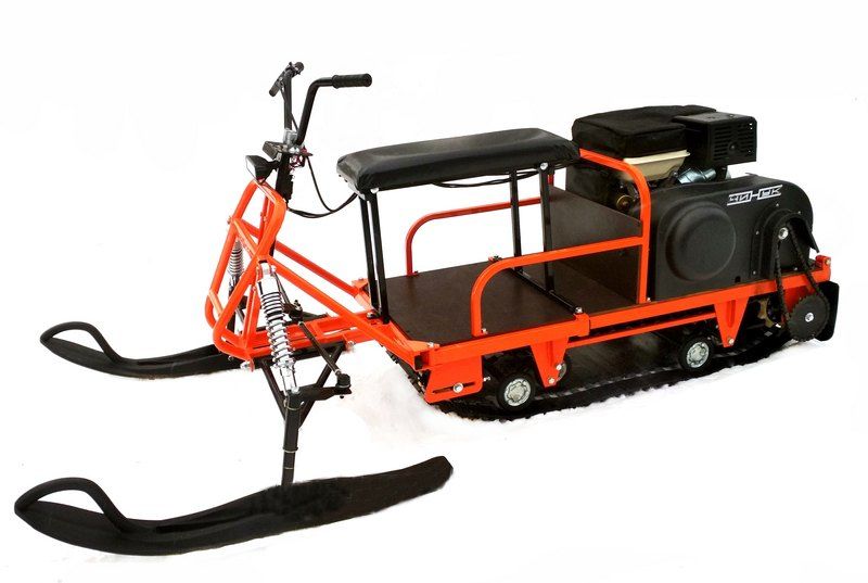 Галогеновая фара 70Вт на мотобуксировщиках с двигателями LIFAN с питанием от встроенной в двигатель генераторной катушки. Отбойник (дополнительная опция). Складной руль на быстросъёмном соединении позволяет перевозить буксировщик не снимая с креплений без увеличения общих габаритов. Изменен механизм натяжки цепи и крепления ведомого вала вариатора. Дополнительная ось на раме, исключающая переворот передних катков при ослабленном натяжении гусеницы. Увеличено межосевое расстояние между задней и передней тележками катков , с целью увеличения площади опоры гусеницы, что позволило дополнительно увеличить проходимость. Применение взаимозаменяемых катковой и катково-склизовой подвесок позволяет без труда заменить один тип на другой и добавляет универсальности буксировщику. Двигатель смещен к центру на 50 мм с целью улучшения развесовки мотобуксировщика и увеличения общей проходимости. Доработано крепление троса газа к рычагу на руле и двигателе исключающее люфты и выпадение троса при прослабленном натяжении. На каждой тележке установлено по 3 пружины, что увеличило энергоемкость подвески и позволяет перевозить еще больше полезного груза. Установлен простой и удобный механизм натяжения гусеницы. Применен одноопорный кронштейн трансмиссии с системой натяжения цепи.