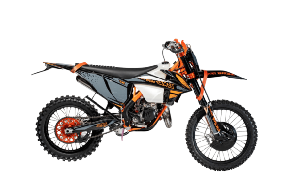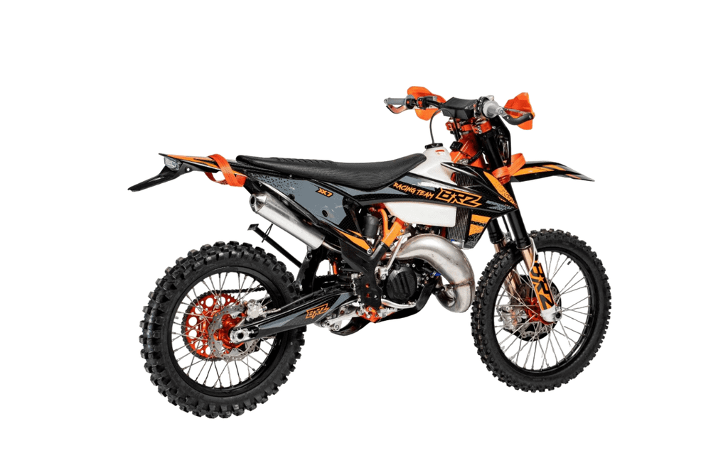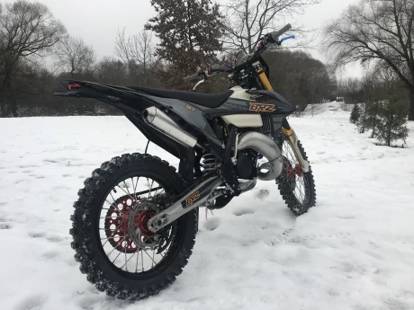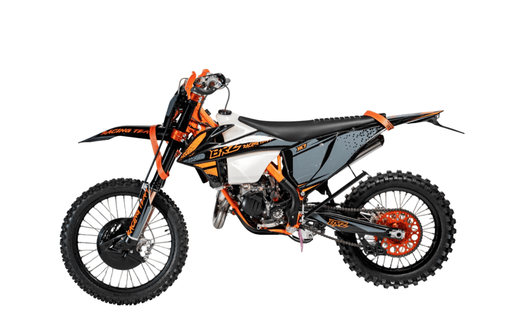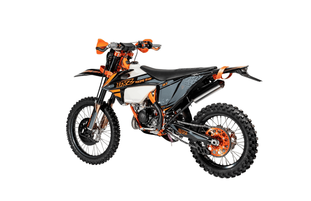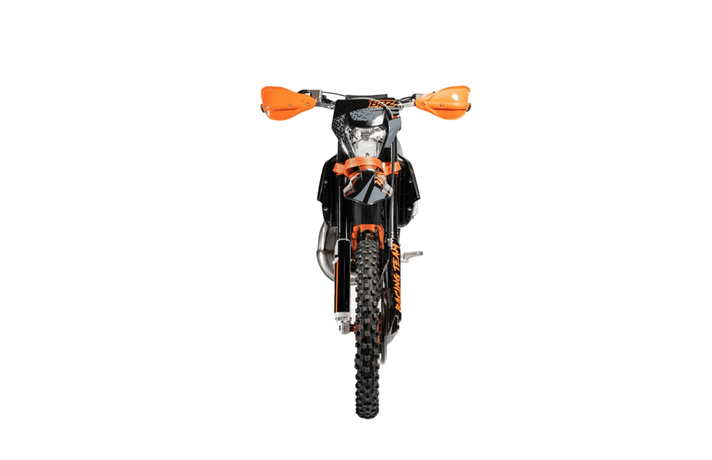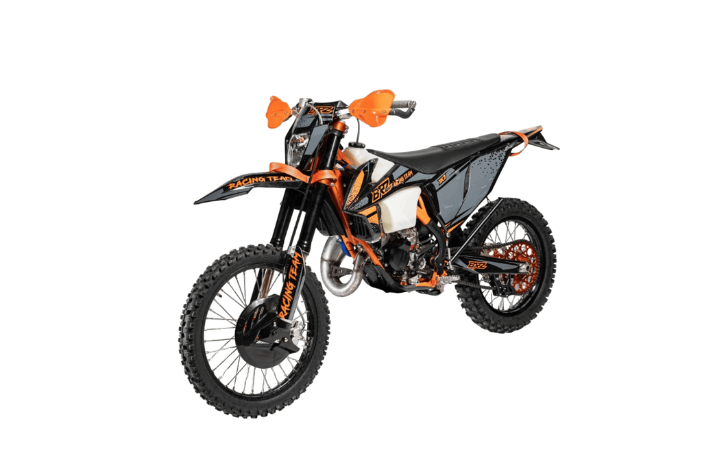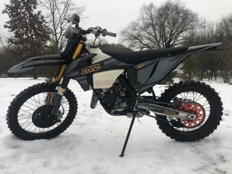 Мотоцикл BRZ X7 идеально себя чувствует в эндуро и кантри кросс дисциплинах. Идеально зайдет после владения «воздушкой». Сочные низа дают уверенность при преодолении сложных препятствий и подъемов с переставками. С газа поднимает на заднее колесо на любой передаче! Двигатель Двигатель За основу мотоцикла взят самый популярный двигатель NC250 (ZS177FMM). В 22 году было принято решение не оснащать двигатель увеличенной поршневой, т.к. 300сс поршневая требует постоянной и сложной подстройки, перебор жиклеров и тп. 250-ка в этом отношении намного проще и стабильнее. Она также более сбалансирована и хорошо работает как на низких, так и на высоких оборотах. Карбюратор В паре с двигателем установлен карбюратор NIBBI PWK 34, надежный и неприхотливый в эксплуатации. Выхлопная система Для реализации всего потенциала двигателя на BRZ X6 применена тюнингованная выхлопная система. Увеличили длину, диаметр выхлопной трубы. Увеличили диаметр и дизайн «груши» для лучшего подпора выхлопных газов, что дает заметный прирост на низах. Сцепление Чтобы передавать всю мощность двигателя на трансмиссию была доработана система сцепления. Установлены усиленные японские диски (железные и фрикционные) от японского бренда F.C.C. Также применена крышка сцепления со встроенной дополнительной форсункой, через которую подается масло и дополнительно охолождает и смазывает пакет дисков. Эта система продляет срок службы сцепления, дает возможность преодолевать сложные препятствия, где нужно «травить» сцеплением. Для облегчения выжима применены специальные тросы с уменьшенным трением за счет специальной полиуретановой оболочки стального троса, а также специальный переходной кронштейн легкого выжима. Радиатор Радиаторы системы охолождения надежно защищены алюминиевой рамкой с распорными втулками. На правом радиаторе в базе установлен вентилятор, также упакованный в алюминиевую защиту, чтобы в критический момент он не вышел из строя. Резиновые шланги были заменены на силиконовые, они лучше справляются с температурой и не высыхают со временем. Шасси Рама Все полноразмерные модели BRZ построены на новой раме K8. Она сделана по подобию рамы KTM 2017-2022 года. Благодаря стальной легкой раме мотоцикл получил правильную развесовку, он лучше рулится в поворотах и более стабилен на больших скоростях. С передней части рамы установлена алюминиевая защита двигателя. Подрамник Подрамник выполнен из алюминия. Легкий и прочный, в отличии от пластикового, выдерживает падения или нежелательного сальто, его можно выправить в случае деформации. Маятник В паре с новой рамой используется новый маятник. Он производится по гравитационной технологии литья, что дает высокую жесткость на скручивание. С завода маятник одет в пластиковую защиту. Она возьмет на себя все царапины и удары. Если захотите вернуть свой мотоцикл к заводскому внешнему виду – просто обновите защиты. Колеса На BRZ X7 применяются усиленные ступицы, которые сделаны из единого куска алюминия, обработанного на ЧПУ станке (CNC