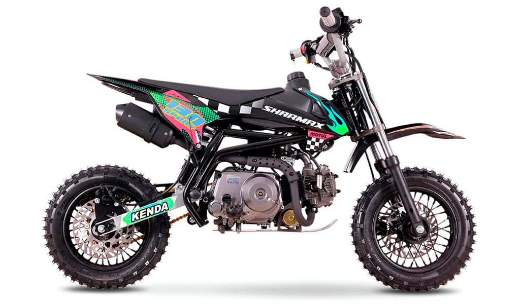 Питбайк оснащён двигателем Sharmax 110FMI мощностью 7 л. с. и объёмом 110 см³. Воздушное охлаждение и карбюратор Keihin PZ 19 обеспечивают стабильную работу мотора в сложных условиях. Запуск осуществляется с помощью электростартера — вам не придётся прилагать лишних усилий, чтобы начать поездку.