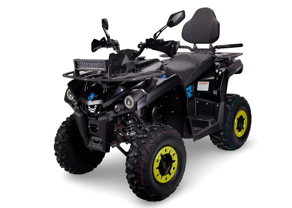 Квадроцикл оснащён четырёхтактным двигателем Juneng 163QMK с балансирным валом. Крепление мотора через сайлентблоки снижает вибрации и повышает комфорт при движении по неровной местности. Для удобства управления задний тормоз вынесен на руль — это освобождает пространство для ног и исключает риск случайного нажатия на педаль на сложных участках.