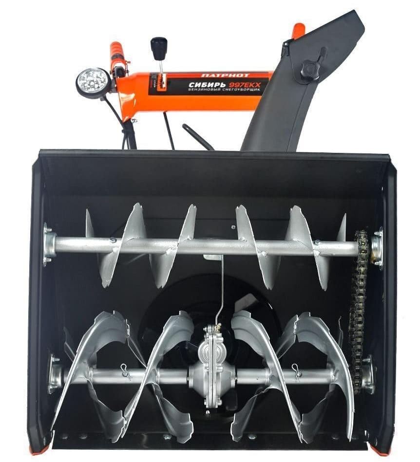 Эта модель укомплектована двумя шнеками, верхний шнек явлеятся запатетнтованной технологией и предназначен для работы с твердыми слоями снега высотой снежного покрова более 40 см, . Двигатель мощностью 6,5 л.с. позволяет справиться с большинством задач по перемещению снега, а наличие четырех скоростей вперед и одной назад обеспечивает высокую маневренность и большой диапазон в выборе оптимального режима работы. В конструкции снегоуборщика используются только подшипники, а не втулки. Шестерня редуктора шнека выполнена из бронзы, что в десятки раз увеличивает ресурс снегоуборщика. На заводе производится регулировка и обкатка каждой единицы техники в собранном состоянии. Преимущества снегоуборщика ПАТРИОТ Сибирь 997 ЕКХ: