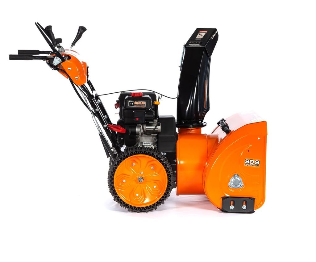 Возможность эффективно перерабатывать снег практически любого типа сложности связана с конструкторским решением сочетания высокой мощности (8,5 л.с.), небольшой ширины уборки (663 мм) и усиленным сцеплением 14-дюймовых безвоздушных шин Runflat. Небольшая ширина ковша, даёт возможность эксплуатировать эту технику на любом приусадебном участке с узкими дорожками. Повышенная высота уборки (540 мм) по сравнению с моделью 80S (510 мм) позволяет применять эту технику при работе с более высоким снегом. Однако это же создаёт определенные ограничения в работе с лежалым снегом с элементами сухого фирна. Рекомендуемый тип снега для 90S для эффективной уборки не должен превышать плотность 400 кг/м3. Дефлектор из усиленного металла позволяет менять направление выброса снега на 190 градусов при помощи рукоятки на корпусе машины. Стальной агрессивный шнек с добавлением хромомолибденового сплава позволяет эффективно справляться даже со слежавшимся снегом.