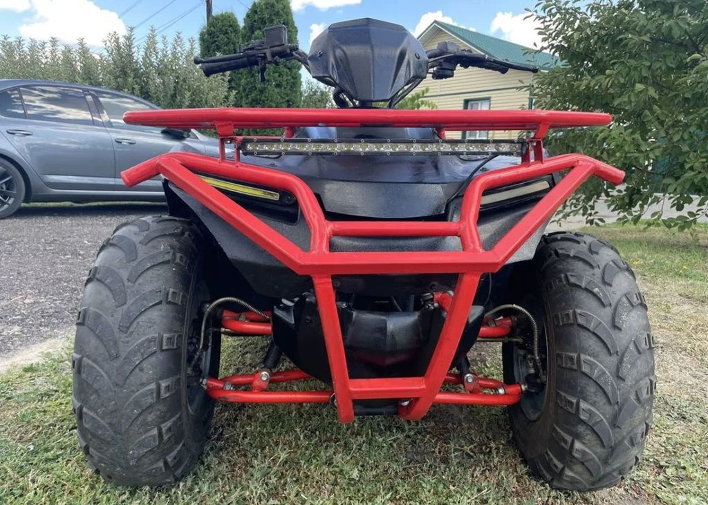 Есть и еще особенности: передача заднего хода встроена в коробку передач - это упрощает конструкцию за счет отказа от отдельного узла и более сложного привода. К тому же имеется ножной тормоз: педаль расположена как на мотоциклах, справа, что в ряде ситуаций имеет свои плюсы и привычнее мотоциклисту . Задние и передние дисковые тормоза дают уверенное торможение на любой дороге. Данный квадроцикл оборудован светотехникой, что позволяет едить в темное время суток. Однако, они не рассчитаны на езду по дорогам общего пользования - только по местности. Но и этого вполне достаточно для выполнения широкого круга работ или получения удовольствия.
