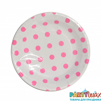 Тарелка круглая белая, розовый горох для проведения дня рождения. Тарелки входят в состав коллекции ГОРОХОВАЯ ВЕЧЕРИНКА товаров для проведения праздников. Упаковка - 12 шт. -