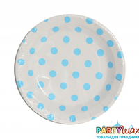 Тарелка круглая белая, голубой горох для проведения дня рождения. Тарелки входят в состав коллекции ГОРОХОВАЯ ВЕЧЕРИНКА товаров для проведения праздников. Упаковка - 12 шт. -